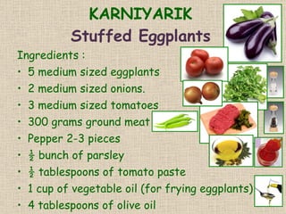 This recipe is for stuffed eggplants called Karniyarik. It calls for eggplants, onions, tomatoes, ground meat, parsley, tomato paste, vegetable oil, olive oil, salt, and black pepper. The eggplants are washed, peeled and soaked in salty water before being fried. Then the inside is scooped out and stuffed with a mixture of sautéed onions and ground meat seasoned with tomato paste, parsley, and tomatoes. The stuffed eggplants are baked with tomato and pepper slices on top until the peppers are cooked. They are served with rice and yogurt.
