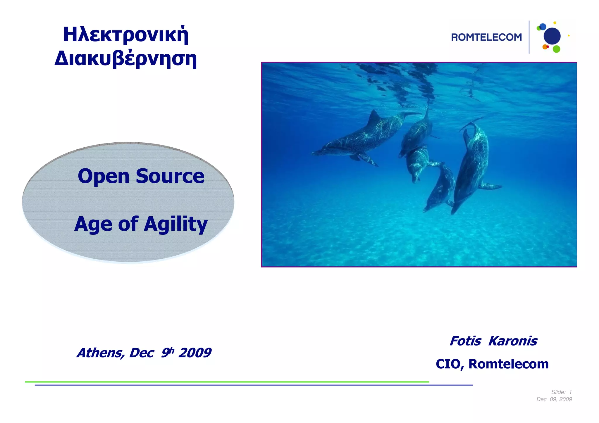 This document discusses open source software and its adoption within Romtelecom. It outlines the cost savings benefits of open source over proprietary software in terms of licensing fees, open standards, security, and total cost of ownership. Examples of commonly used open source solutions are provided, such as Apache web server and Moodle e-learning platform. The document also describes Romtelecom's use of Moodle for e-learning with 5,000 users in 2009 at minimal operational costs. Finally, examples of Romtelecom systems using open source are presented, providing estimated total capital expenditure and operational expense savings.