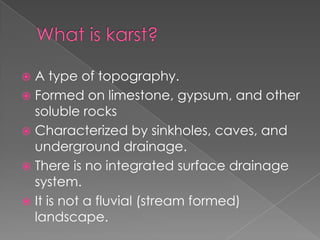 Karst topography is a landscape formed on soluble rocks like limestone and gypsum, characterized by sinkholes, caves, and underground drainage, with no integrated surface drainage system as water drains underground rather than forming streams.