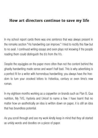 Copy writing portfolio containing work that i have done during my 18 months at Goldfish creatives and one month as an intern at Origami creative concepts.