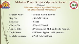 This document provides information about different types of milk products and the processing of ice cream and kulfi. It begins with a classification of milk products into 6 categories: heat desiccated, heat and acid coagulated, fermented, fat rich, frozen, and dried. Next, it details the processing steps for ice cream, including ingredient selection, mixing, pasteurization, homogenization, ageing, freezing, packaging, and hardening. It then discusses the packaging, yield, shelf life, and nutritional value of ice cream. A similar level of detail is then provided about the processing of kulfi, including the ingredients, flow chart, packaging, yield, shelf life, and nutritional information.