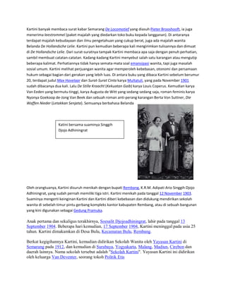 Raden Ayu Kartini, lahir pada 21 April 1879, adalah seorang pahlawan nasional Indonesia dan pelopor kebangkitan perempuan pribumi. Meskipun terlahir dalam keluarga bangsawan, ia memanfaatkan pendidikan dan surat-menyurat dengan teman di Belanda untuk memperjuangkan emansipasi wanita. Kartini meninggal pada usia 25 tahun, tetapi pemikirannya terus menginspirasi gerakan perempuan dan kebangkitan nasional di Indonesia.