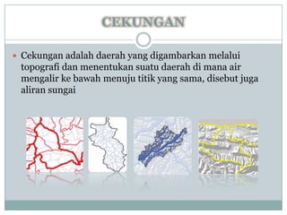 Dokumen tersebut membahas tentang kartografi digital dan beberapa konsep dasar yang terkait seperti cekungan, tapak bangunan, tanah, dan geologi. Informasi kunci yang disampaikan adalah definisi dari konsep-konsep tersebut beserta penjelasan singkat mengenai representasi datanya dalam kartografi digital.