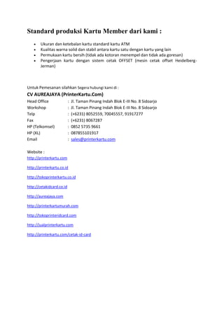 Kartu member adalah kartu yang memberikan keuntungan kepada anggota perusahaan atau organisasi, serta menciptakan kesan eksklusif. Pencetakan kartu member biasanya menggunakan PVC dan dapat dipersonalisasi dengan data seperti nama dan barcode, menggunakan berbagai metode cetak. Untuk pemesanan dan informasi lebih lanjut, dapat menghubungi CV Aureajaya di kontak yang tertera.