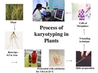 A karyotype is the number and appearance of chromosomes in a cell and can provide information about an organism's species. Key features used to characterize karyotypes include chromosome size, centromere position, and banding patterns. Karyotypes can be symmetric or asymmetric and are often represented visually using idiograms or karyograms. Analysis techniques like G-banding stain chromosomes to reveal identifying patterns. Comparing karyotypes across species provides insights into evolutionary mechanisms like centric fusion and fission that alter chromosome counts. In primates, chromosomal changes like the fusion that formed human chromosome 2 are important in lineage evolution.