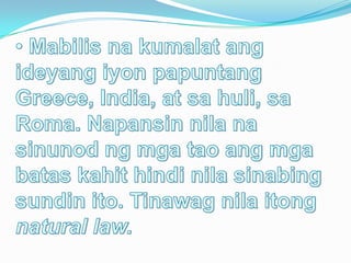 The document discusses the origins and development of human rights starting from ancient codes like the Code of Hammurabi in 1780 BC, through documents like the Magna Carta in 1215 and the US Declaration of Independence in 1776. It then covers important milestones in establishing rights like the US Bill of Rights in 1791, the Declaration of the Rights of Man and the Citizen in 1789, the First Geneva Convention in 1864, the formation of the UN in 1945, and the Universal Declaration of Human Rights in 1948 which helped define and standardize human rights globally.