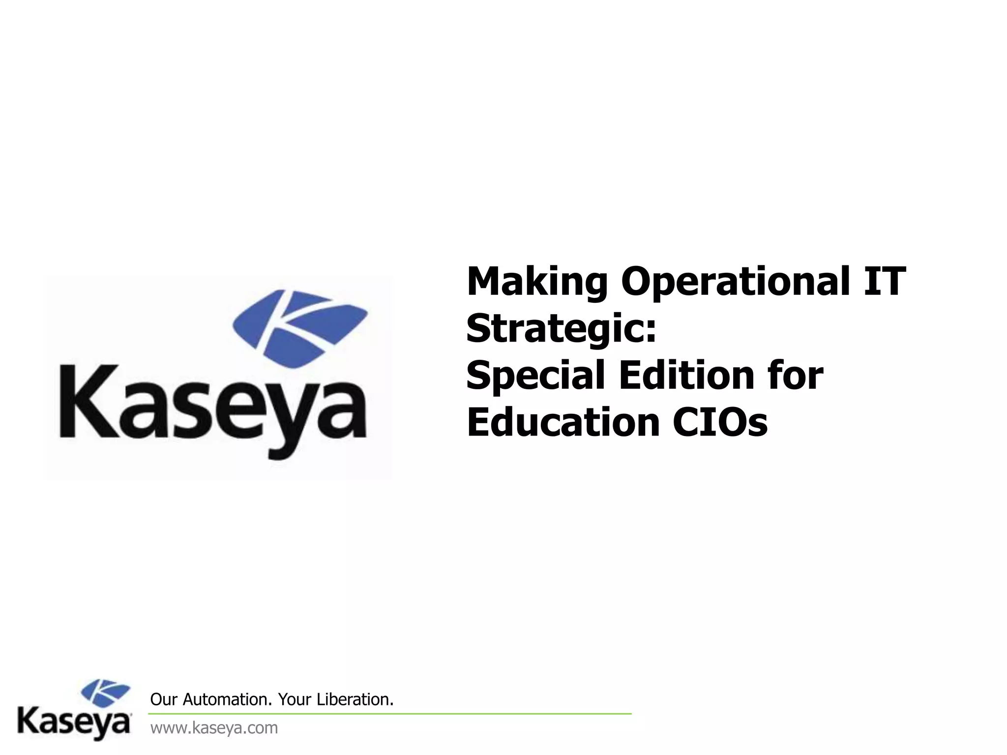 This document discusses how educational IT departments can become more strategic by focusing on operational efficiency and innovation. It recommends that educational CIOs shift the balance towards preventative and invisible IT operations using automation. Specific best practices include setting aggressive targets to reduce costs through automation, publicly demonstrating budget reductions while maintaining or improving service quality, and empowering end users through self-service options while maintaining central control. The document promotes the use of the Kaseya platform to achieve operational efficiencies and gain strategic influence through features like automated procedures, reporting, remote management, and centralized software deployment.