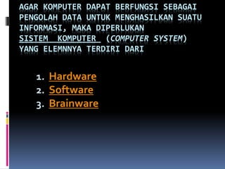 Dokumen ini menjelaskan elemen-elemen dalam sistem komputer yang terdiri dari hardware, software, dan brainware. Hardware mencakup perangkat fisik seperti CPU dan perangkat penyimpanan, sedangkan software mencakup program yang menjalankan fungsi tertentu. Brainware merujuk pada pengguna komputer yang terlibat dalam pemakaian sistem tersebut.