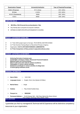This resume is for MD Kashif Iqbal, seeking a job where he can enhance his knowledge and capabilities. He has over 2.5 years of experience in finance and business development. He holds an MBA in Finance and a BCom degree. His most recent role was as an accountant for AL-Qaryan Group of Trading and Contracting Company since July 2016. He is proficient in MS Office, various accounting software, and enjoys activities like cricket and chess.