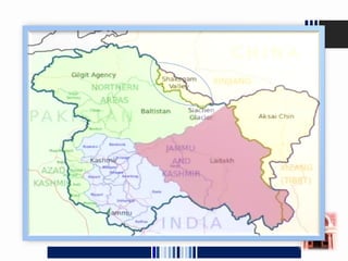 The document summarizes the history of the Kashmir conflict between India and Pakistan since partition in 1947. It discusses that Kashmir is currently divided between Indian administered Jammu and Kashmir, Pakistani administered Azad Kashmir, and Chinese controlled Kashmir. It outlines several proposed solutions to resolve the conflict such as making the Line of Control an official border, dividing Kashmir along the Chenab river, granting independence, or providing autonomy under joint Indian-Pakistani control similar to Andorra. However, it notes that implementing any solution requires agreement between India and Pakistan, which has so far not been possible given both countries' claims over the territory.
