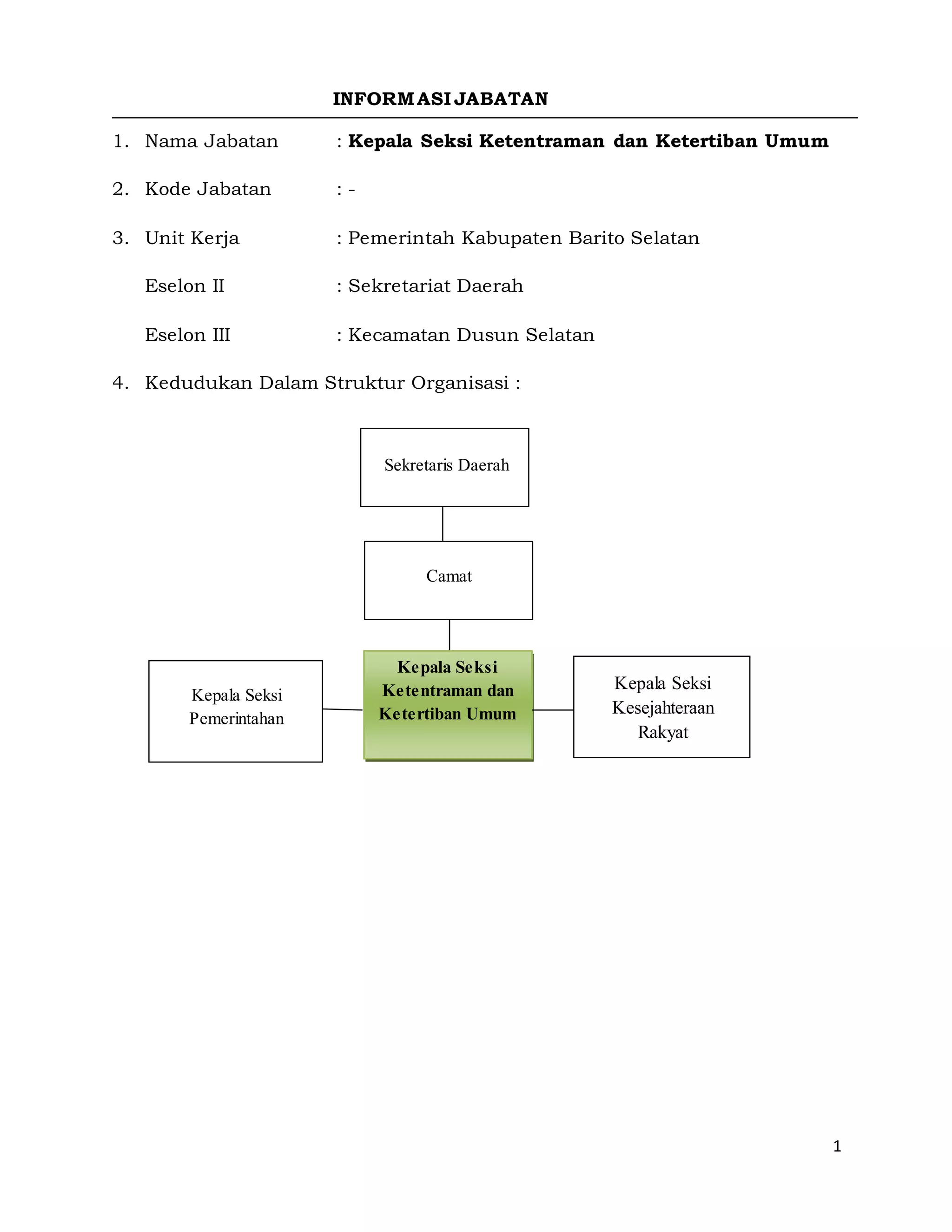 Dokumen ini menjelaskan informasi jabatan Kepala Seksi Ketentraman dan Ketertiban Umum di Pemerintah Kabupaten Barito Selatan, termasuk tugas dan tanggung jawab dalam mengelola ketentraman serta ketertiban umum. Uraian tugas mencakup penyusunan program, evaluasi pelaksanaan, dan pengawasan terhadap bawahan, serta interaksi dengan instansi terkait. Dokumen ini juga mencakup syarat jabatan dan kondisi kerja yang perlu dipenuhi oleh pejabatan tersebut.