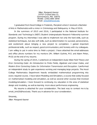 Jillian Margaret Kasner graduated from Hood College in 2016 with a Bachelor's degree in Mathematics and a minor in Criminology. She participated in internships at NIST in 2015 and 2016 where she gained hard skills like statistical techniques and soft skills like communication. She is willing to put in extra time to complete projects and has attached contact information for references.