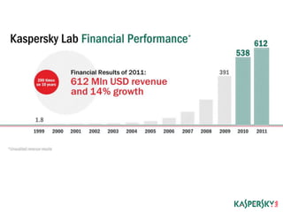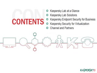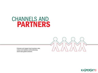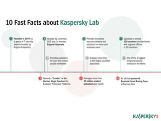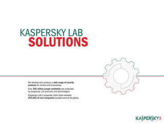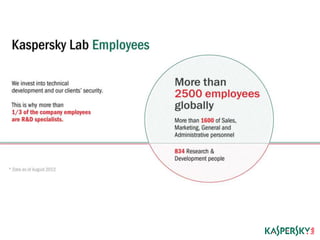 Kaspersky Lab is recognized as a leader in the IT security market according to Gartner, IDC, and Forrester. The document discusses various Kaspersky solutions for protecting data and devices, particularly in mobile and BYOD environments, including anti-malware, patch management, and mobile device management. It also highlights the Kaspersky Partner Program, which offers benefits such as lead generation, training, and flexible licensing options for partners.