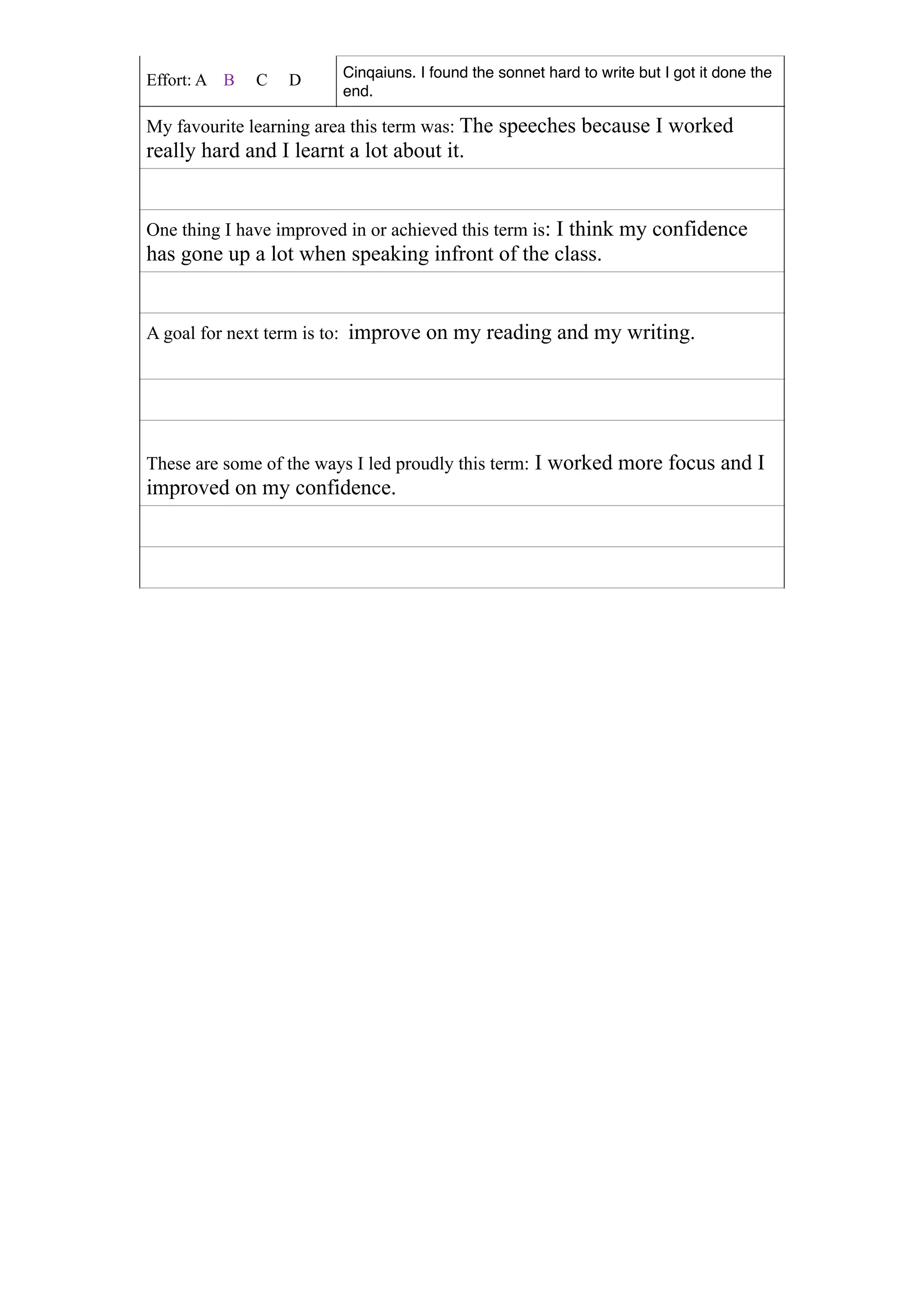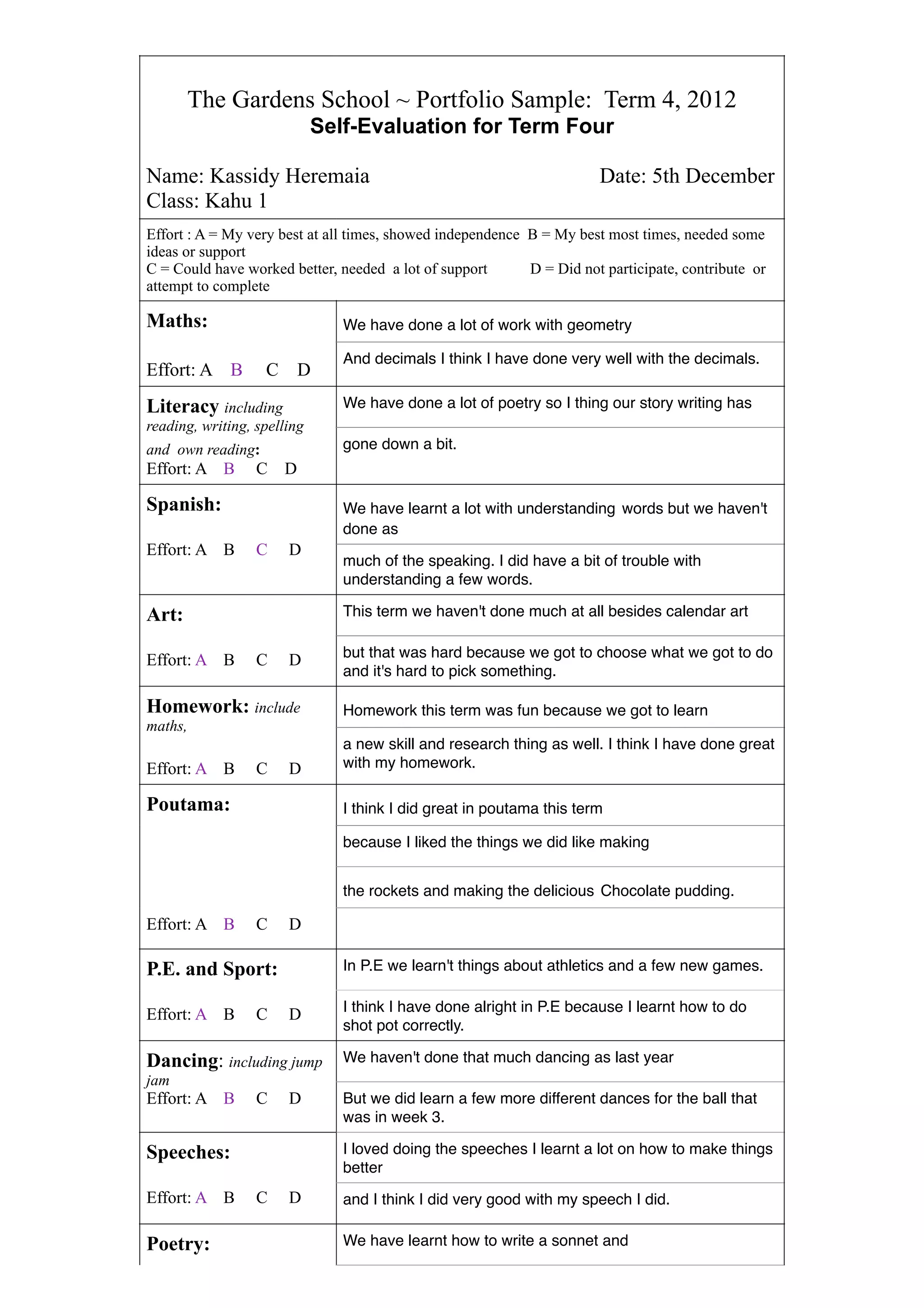 Kassidy evaluated her performance in various subjects for the fourth term. She felt she did well in math, specifically with decimals, and enjoyed learning new skills in homework and Poutama class. While her story writing declined, she improved her confidence in speaking to the class. For next term, her goals are to improve her reading and writing.