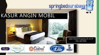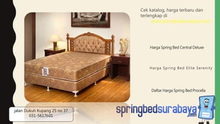 Dokumen ini berisi informasi tentang harga dan spesifikasi berbagai jenis spring bed yang dijual oleh toko spring bed bernama www.springbedsurabaya.com yang beralamat di Jalan Dukuh Kupang 25 no 37 Surabaya serta kontak telepon 031-5617601.
