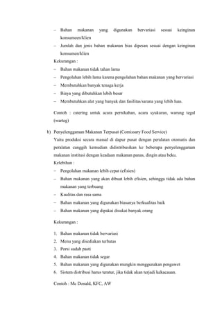 Dokumen ini membahas tentang subsistem penyelenggaraan makanan dan dampak jika salah satu subsistem tidak berfungsi dengan baik, seperti kesalahan dalam perencanaan menu yang dapat mengganggu seluruh proses penyediaan makanan. Selain itu, dibahas juga kelebihan dan kekurangan dari empat sistem produksi makanan: konvensional, terpusat, siap pakai, dan siap saji, dengan contoh penerapan masing-masing sistem. Kesimpulannya, efisiensi, biaya, dan kesegaran bahan makanan menjadi pertimbangan utama dalam memilih sistem yang tepat.