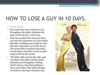 The document provides an analysis of trailers for three films - How to Lose a Guy in 10 Days, We're the Millers, and Taken. For each trailer, it summarizes the effective elements that entice the audience, including the music chosen, scenes selected to show the storyline and characters, and title design. Elements like up-beat music, split screens during tense moments, and dramatic conversations keep the audience engaged in each trailer analyzed.