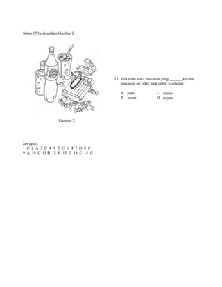Dokumen ini berisi soalan-soalan untuk memilih kata adjektif yang paling tepat untuk mengisi ruang kosong dalam kalimat-kalimat yang diberikan. Soalan-soalan tersebut mencakupi berbagai konteks seperti bunga, makanan, manusia, benda mati dan lainnya.