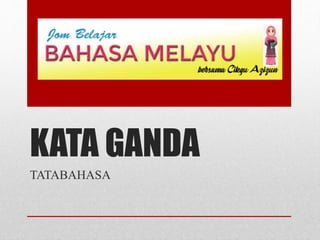 Kata ganda adalah proses pengulangan kata secara keseluruhan atau bahagian tertentu, yang dikelaskan kepada kata ganda seluruh, separa, berentak, dan berimbuhan. Terdapat pelbagai jenis kata ganda seperti pengulangan penuh, separa, berima, dan yang menerima imbuhan. Contoh-contoh diberikan untuk setiap jenis, menunjukkan pengulangan kata dalam konteks yang berbeza.