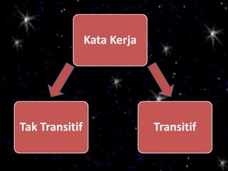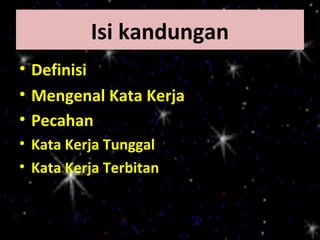 Dokumen ini menerangkan tentang kata kerja, termasuk definisi, jenis-jenis kata kerja seperti transitif dan tak transitif, serta bagaimana mengenal pasti kata kerja. Ia juga menjelaskan mengenai pecahan kata kerja, penggunaan kata bantu, dan contoh-contoh ayat untuk setiap jenis kata kerja. Rujukan juga disertakan untuk tatabahasa yang digunakan.