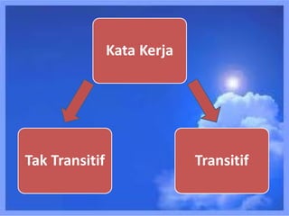 Dokumen ini membincangkan kata kerja, termasuk contoh dan pengelompokan jenis kata kerja seperti transitif dan tak transitif. Ia menerangkan cara mengenal kata kerja serta penggunaannya dalam ayat, termasuk jenis pelengkap yang digunakan. Terdapat juga penjelasan mengenai kata kerja tunggal dan terbitan serta contoh-contohnya.