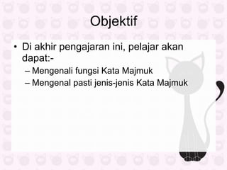 Dokumen ini membahas tentang kata majmuk, termasuk definisi, jenis, dan contoh penggunaannya. Terdapat tiga jenis kata majmuk, yaitu rangkaian bebas, istilah khusus, dan simpulan bahasa. Selain itu, dijelaskan pula mengenai penggandaan dan pengimbuhan kata majmuk.