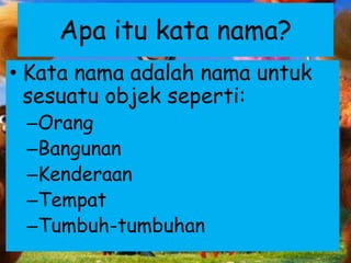 Kata nama adalah istilah yang digunakan untuk merujuk kepada objek, termasuk orang, bangunan, kenderaan, tempat, dan tumbuh-tumbuhan.