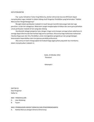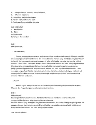 Dokumen ini adalah makalah yang membahas hakikat manusia dan pengembangannya dalam konteks pendidikan, dengan tujuan untuk memahami pengertian dan dimensi-dimensi hakikat manusia. Pembahasan mencakup ciri khas manusia yang memisahkannya dari hewan, serta pentingnya pendidikan dalam mengembangkan potensi tersebut. Penulis mengharapkan kritik dan saran untuk penyempurnaan makalah di masa mendatang.