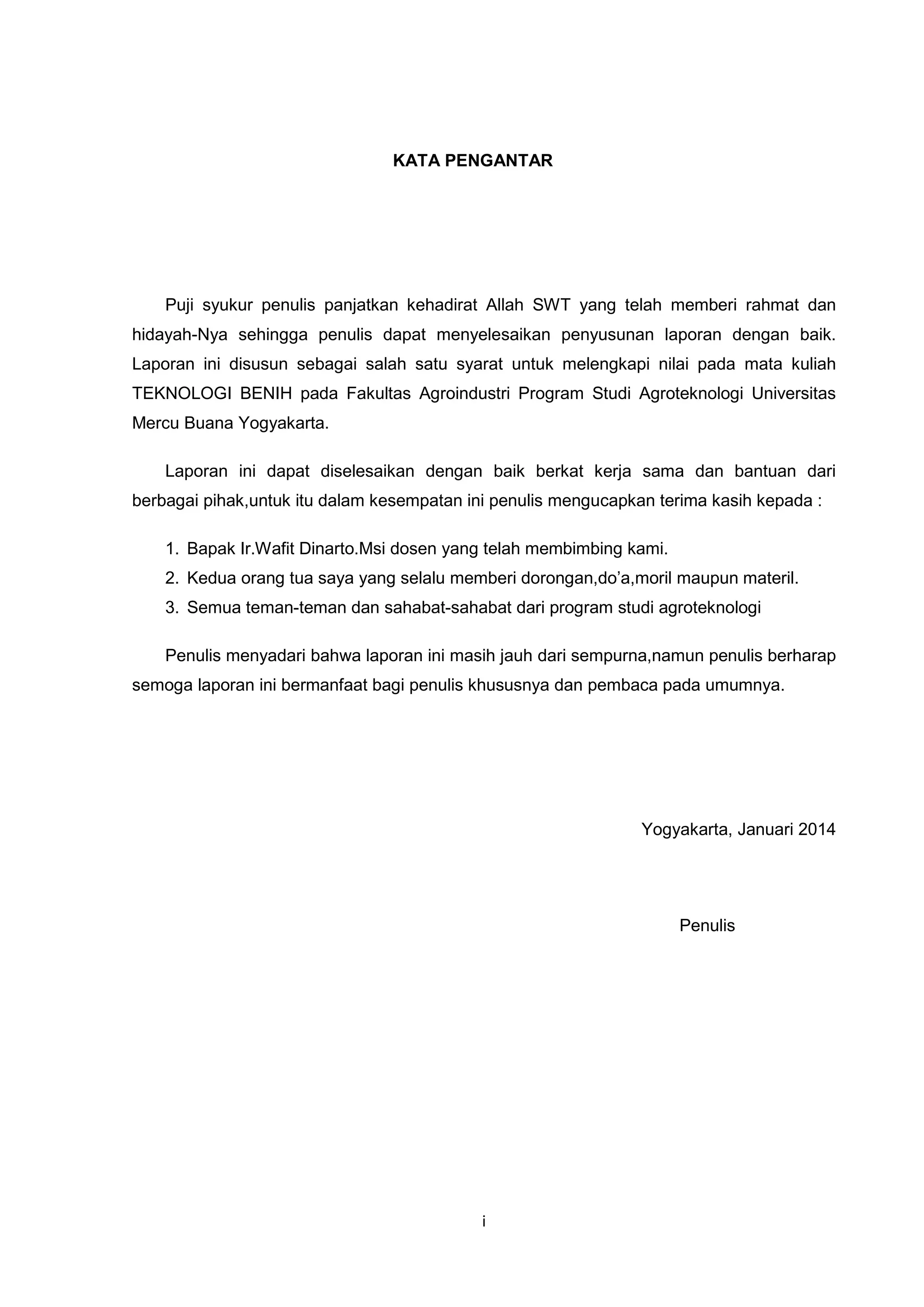(1) Dokumen tersebut merupakan laporan praktikum tentang teknologi benih yang disusun untuk memenuhi salah satu syarat mata kuliah di universitas, (2) Laporan ini berisi pengantar, daftar isi, latar belakang, tujuan praktikum, dasar teori, materi dan metode, hasil dan pembahasan, kesimpulan, daftar pustaka dan lampiran, (3) Penulis mengucapkan