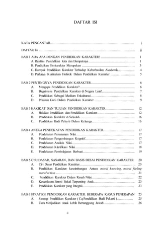 Dokumen tersebut merupakan ringkasan buku karya Masnur Muslich tentang Pendidikan Karakter. Ringkasannya membahas tentang pentingnya pendidikan karakter, hakikat dan tujuan pendidikan karakter, pendekatan-pendekatan pendidikan karakter, ciri dasar, sasaran dan basis pendidikan karakter, serta strategi-strategi pendidikan karakter yang diterapkan di berbagai konteks pendidikan.