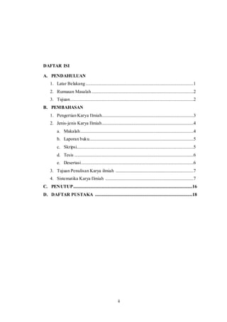 Makalah ini membahas berbagai istilah karya ilmiah seperti makalah, laporan buku, skripsi, tesis, dan disertasi dalam konteks metode penelitian pendidikan. Penulis mengucapkan terima kasih kepada dosen yang membimbing dan berharap makalah ini dapat bermanfaat serta menerima kritik dan saran untuk perbaikan. Struktur makalah mencakup pendahuluan, pembahasan, serta penutup.