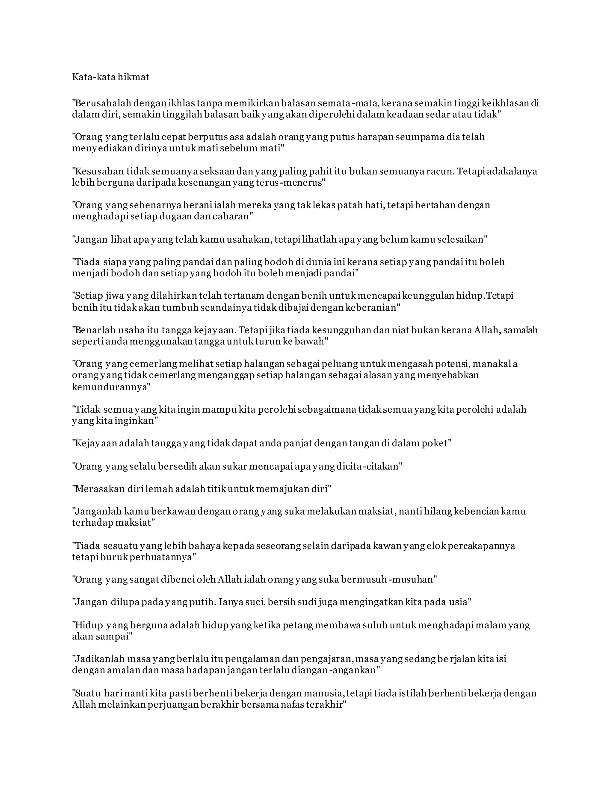 Koleksi kata-kata hikmat ini memberikan nasihat tentang kerja keras, keikhlasan, kesabaran, keberanian, dan tujuan hidup yang bermakna. Beberapa pesan kunci meliputi pentingnya berusaha dengan ikhlas, jangan mudah menyerah, dan lihat halangan sebagai peluang untuk tumbuh.
