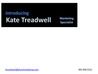 The document outlines the career and experience of ktreadwell@phuelmarketing.com, including marketing roles at Credit Collections, Inc. and Oklahoma Therapy Institute from 2005-2009, and as media executive and creative director at Phuel Marketing from 2010 to present, where they are responsible for budgeting, planning, and implementing multi-media marketing campaigns for over 10 clients. Examples of work include writing scripts, directing commercials, developing marketing budgets and strategies, and case studies demonstrating proven results such as significant growth in social media followers and business for clients.