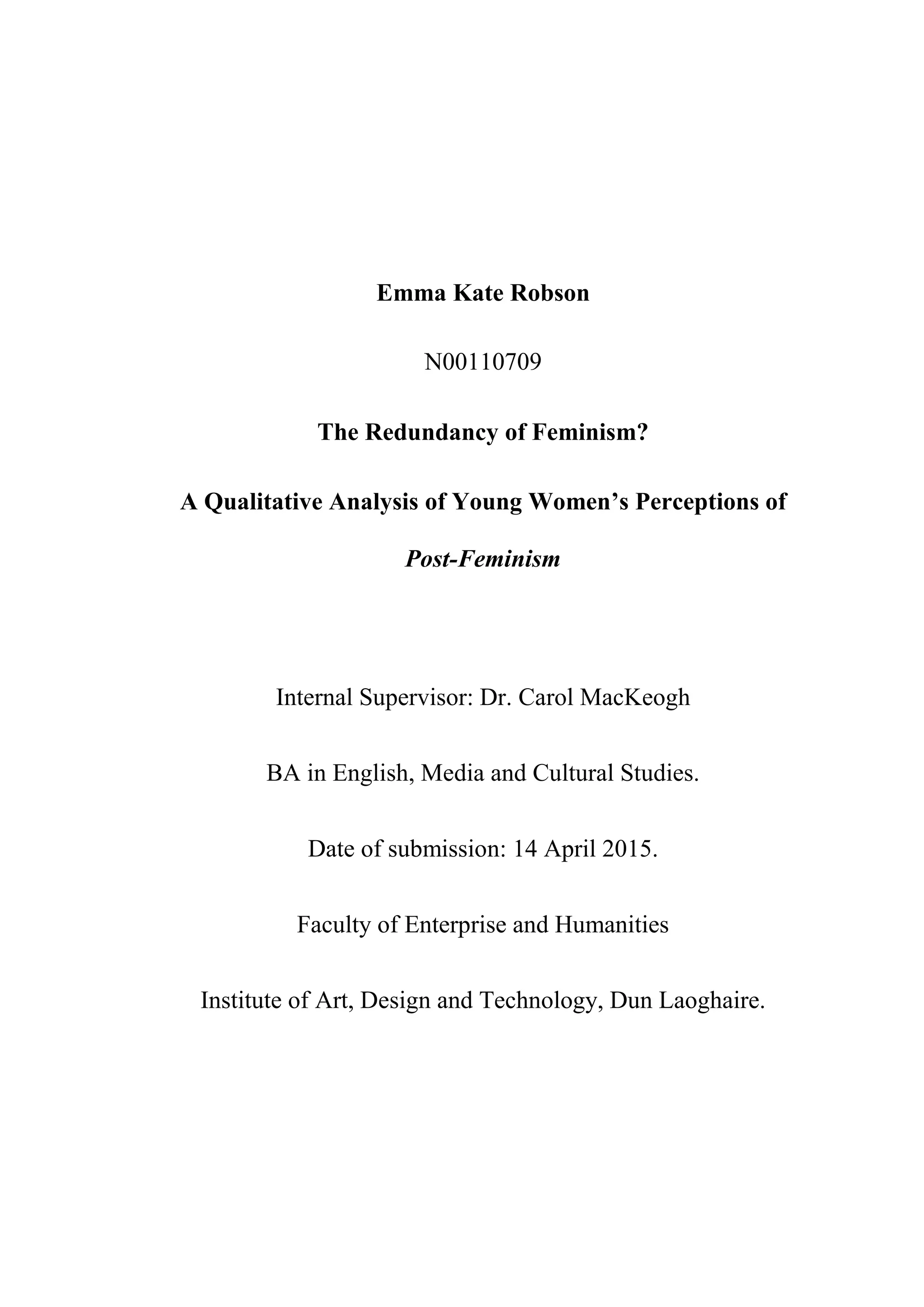 This document provides a literature review of academic critiques of post-feminism. Several theorists are discussed who largely view post-feminism negatively as a backlash against second-wave feminism. They argue post-feminism has been proliferated by media portrayals of empowered women and a focus on their bodies. Critics assert post-feminism has been institutionalized, particularly through education, to present feminism as outdated and install a new "sexual contract" for women focused on work and consumerism. The literature reveals shared views that post-feminism undermines feminist goals of equality, but definitions remain ambiguous despite common critiques.