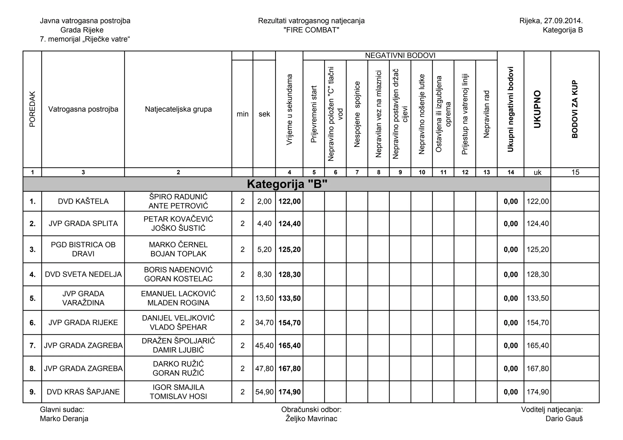 Na 7. memorijalu 'riječke vatre', održanom 27.09.2014., zabilježeni su rezultati vatrogasnog natjecanja 'fire combat' u kategoriji B, gdje su sudionici ocjenjivani prema različitim pravilima i pravilnostima. JVP grada Rijeke osvojila je peto mjesto, dok su prva tri mjesta pripala DVD Kaštela, JVP grada Splita i PGD Bistrica ob Dravi. Natjecanje je predvodio glavni sudac Marko Deranja, a rezultati uključuju niz detalja o vremenu i negativnim bodovima za nepravilan rad.
