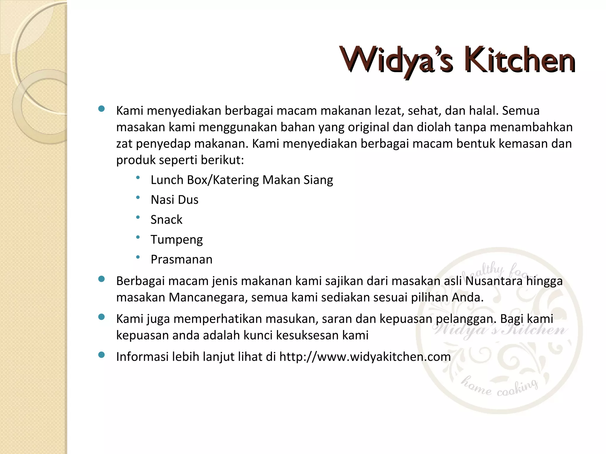 Widya's Kitchen menyediakan berbagai makanan lezat, sehat, dan halal, menggunakan bahan original tanpa zat penyedap. Jenis makanan yang ditawarkan mencakup masakan nusantara dan internasional, serta opsi layanan seperti catering, nasi dus, snack, dan prasmanan. Kepuasan pelanggan menjadi prioritas utama, dan informasi lebih lanjut dapat diakses melalui situs web mereka.