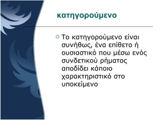 Kathgoroumeno 1. 2. κατηγορούμενο Το κατηγορούμενο είναι συνήθως, ένα επίθετο ή ουσιαστικό που μέσω ενός συνδετικού ρήματος αποδίδει κάποιο χαρακτηριστικό στο υποκείμενο 3. Ως κατηγορούμενο όμως μπορούν να χρησιμοποιηθούν: Επίθετο ουσιαστικό μετοχή αντωνυμία αριθμητικό απαρέμφατο επίρρημα O νοματική πρόταση 4. εἰμί, γίγνομαι, τυγχάνω, πέφυκα, διατελῶ, ἔφυν, καθίσταμαι, ἀποβαίνω, ἐκβαίνω μερικά ρήματα που έχουν παθητική διάθεση όπως: α) τα δοξαστικά: νομίζομαι, φαίνομαι, κρίνομαι, δοκῶ β) τα κλητικά: καλοῦμαι, ὀνομάζομαι, προσαγορεύομαι γ) όσα σημαίνουν εκλογή: αἱροῦμαι, χειροτονοῦμαι, λαγχάνω Συνδετικά ρήματα 5. Παραδείγματα Ἐπίδαμνός ἐστι πόλις τὰ μὲν κατηγορημένα οὕτως ἐστὶ πολλά και δεινά πᾶς νόμος ἐστι εὕρημα μὲν καὶ δῶρον θεῶν ἡ μὲν φύσις ἐστὶν ἄτακτον Οἱ ἐθελονταί ἦσαν δισχίλιοι Εἰμί τυράννῳ ἐοικώς Τό σιγᾶν ἐστι σωφρονεῖν Ἡ ἀγορά ἦν πλησίον Φίλιππος ἐστιν ὅ,τι ἄν εἴποι τις 6. γενική κατηγορηματική γενική κατηγορηματική : γενική κατηγορηματική κτητική γενική κατηγορηματική της καταγωγής γενική κατηγορηματική διαιρετική γενική κατηγορηματική της ύλης γενική κατηγορηματική της ιδιότητας γενική κατηγορηματική της αξίας Γενική κατηγορηματική Πολλές φορές στη θέση ενός κατηγορουμένου που εκφέρεται σε όμοια πτώση με το υποκείμενο βρίσκουμε τη γενική ενός ουσιαστικού 7. Παραδείγματα Γενική Κατηγορηματική 1. οἰκία τοῦ πατρός 2. οἱ νόμοι τοῦ Σόλωνος 3. ὁδὸς πέντε ἡμερῶν 4. ἀγρὸς ἄξιος ταλάντου 5. κρηπὶς λίθων 6. πλοῖα σίτου 7. φόνου ὑπόδικος/ αἴτιος κακῶν 8. Ἀναρχίας μεῖζον οὐκ ἔστι κακόν. 9. ἐπιμελὴς ἦν τῶν παίδων 10.ἀλλὰ ἡ δίκη μόνον ἦν χιλίων δραχμών 8. Παραδείγματα Ἐπίδαμνός ἐστι πόλις τὰ μὲν κατηγορημένα οὕτως ἐστὶ πολλά και δεινά πᾶς νόμος ἐστι εὕρημα μὲν καὶ δῶρον θεῶν ἡ μὲν φύσις ἐστὶν ἄτακτον Οἱ ἐθελονταί ἦσαν δισχίλιοι Εἰμί τυράννῳ ἐοικώς Τό σιγᾶν ἐστι σωφρονεῖν Ἡ ἀγορά ἦν πλησίον Φίλιππος ἐστιν ὅ,τι ἄν εἴποι τις 9. Συνήθη ονόματα που είναι επιρρηματικά κατηγορούμενα : πολύς, μέγας, ἄφθονος, ἑκών, ἑκούσιος, ἑθελοντής, ἑθελούσιος, ἄκων, ἀκούσιος, ἄσμενος, ἥσυχος, ὑπόσπονδος, πρῶτος, τριταῖος, τελευταῖος, σκοταῖος, πελάγιος, ἀπότομος, ἐνάντιος, ἀντίος, βοηθός, σύμβουλος 10. Προληπτικό κατηγορούμενο ή του αποτελέσματος • Τα ρήματα που σημαίνουν εξέλιξη, όπως αὔξομαι, αὐξάνομαι, αἴρομαι, τρέφομαι, πνέω, ῥέω κ.τ.ό. δέχονται κατηγορούμενο το οποίο αποδίδει στο υποκείμενό τους μιαν ιδιότητα την οποία δεν έχει ακόμη, αλλά θα είναι το τελικό αποτέλεσμα της εξέλιξης που δηλώνει το ρήμα. 11. Παραδείγματα Καί ᾔρετο τό ὕψος τοῦ τείχους μέγα Φίλιππος ηὔξηται μέγας ἐκ μικροῦ Εἷς τις ὑπό ταῦ δήμου ἐτράφη μέγας Ὁ Ἀσωπός ποταμός ἐρρύη μέγας Ὁ ἄνεμος ἔκπνει μέγας 12. Ρήματα συντάσσονται με δύο αιτιατικές, από τις οποίες η μία είναι κατηγορούμενο της άλλης Οσα σημαίνουν: λέγω, καλῶ, προσαγορεύω, ὀνομάζω Όσα σημαίνουν: ποιῶ, καθίστημι, τίθημι, ἀποδείκνυμι, ἀποφαίνω, αἱροῦμαι, χειροτονῶ Όσα σημαίνουν: νομίζω, ἡγοῦμαι, κρίνω Οσα σημαίνουν: ἔχω, δίδωμι, λαμβάνω, παραλαμβάνω, παρέχω