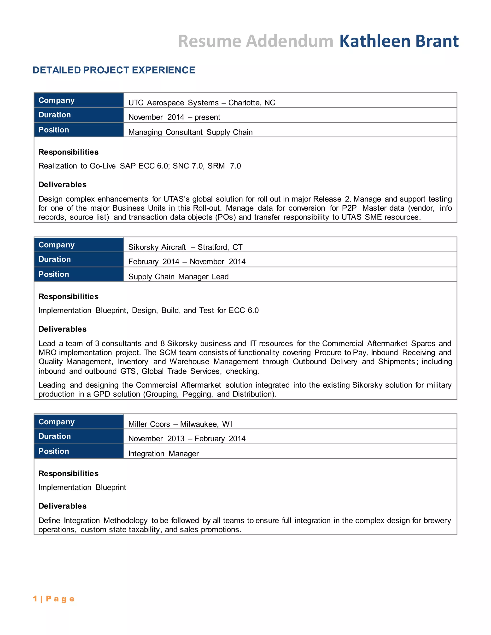 Kathleen Brant has over 15 years of experience leading SAP implementation projects for supply chain management. She has managed projects involving SAP ECC 6.0, SRM, and Solution Manager implementations for various industries. Some of her responsibilities include blueprinting processes, managing testing, and training users. She has worked with many large companies across various industries to implement SAP solutions for procurement, inventory, and warehouse management.