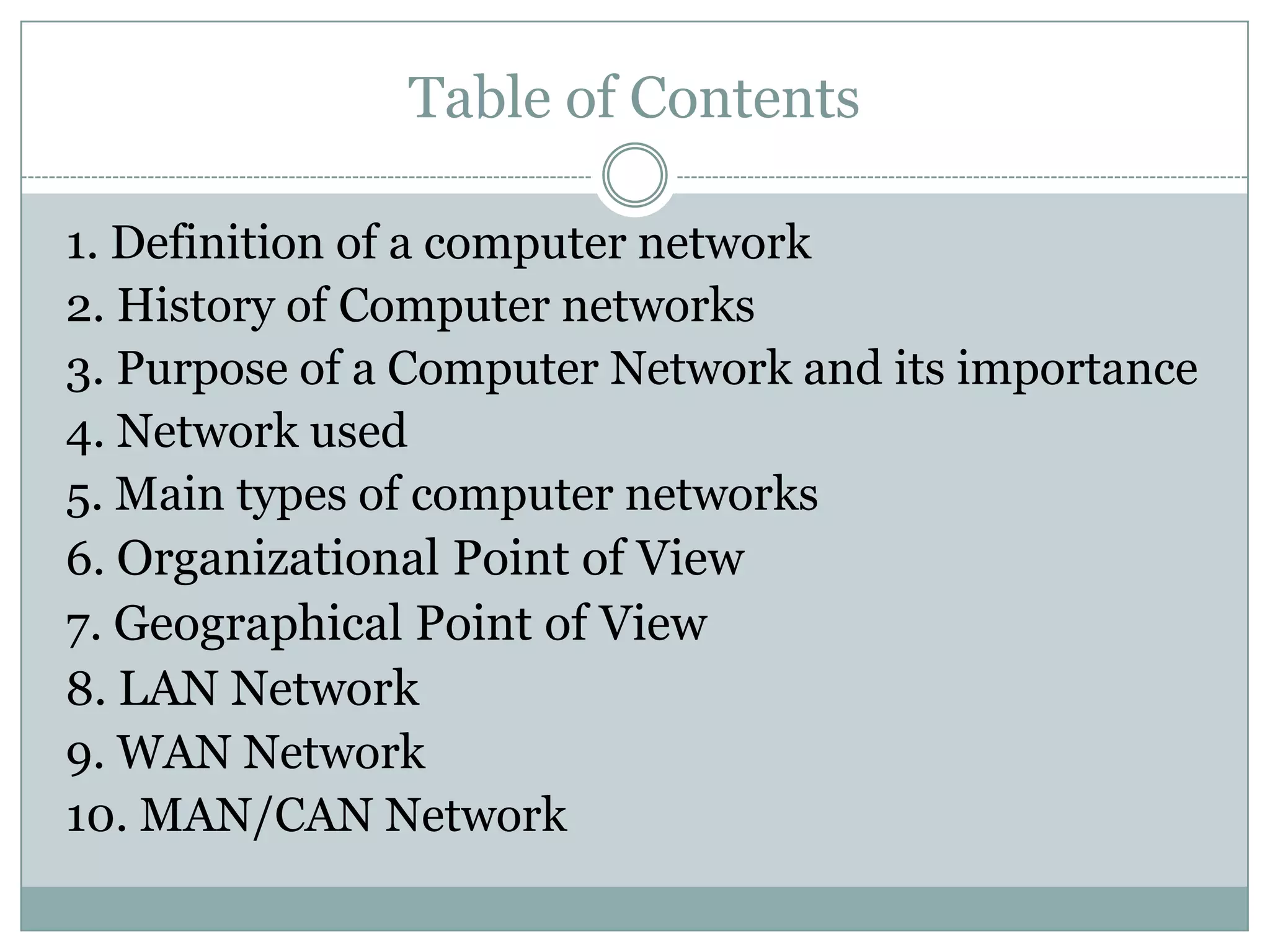 This document provides an overview of computer networks, including definitions, history, purposes, types, and how networks have changed the world. It defines a computer network as a collection of interconnected devices that allow sharing of resources and information. Networks originated in the late 1950s and were developed by the military and for airline reservations. There are three main types of networks based on organization (peer-to-peer and server-based), geography (LAN, WAN, MAN), and computing model (centralized and client-server). Networks now connect computers worldwide, allowing fast transmission of documents and information.
