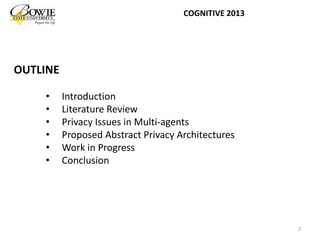 This document provides an overview of data privacy challenges in multi-agent learning systems. It discusses literature on privacy issues in multi-agent systems, including problems related to autonomy, trust, and defining privacy. Key privacy issues for multi-agent systems are identified as information collection, processing, and dissemination by agents. Several proposed abstract architectures aim to address privacy in multi-agent design, but challenges remain regarding trade-offs between privacy and data utility.