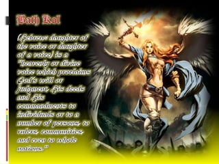This document discusses various religious figures from Judaism, Christianity, and Islam that are often featured in fantasy works, including angels, demons, and mythological beings. It defines the Bath Kol as a heavenly voice that proclaims God's messages. It also mentions the archangels St. Michael and St. Gabriel, Lucifer who is associated with the devil, the first woman Lilith from Genesis, the vampire Dracula, Eve who was Adam's wife, and the biblical giant Goliath who fought David. The figures presented come from religious texts and traditions.