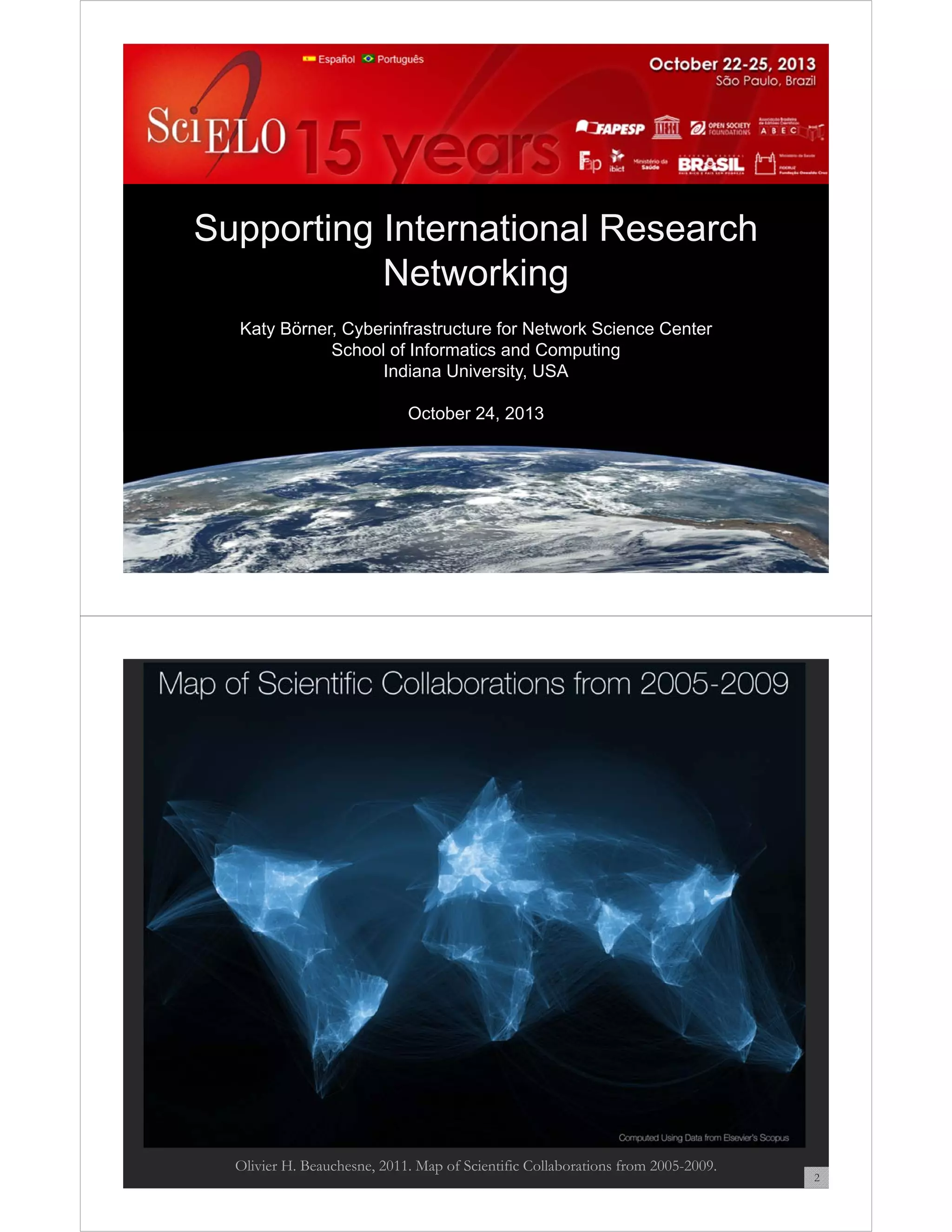 The document discusses research networking services designed to enhance collaboration, manage research, and facilitate knowledge flow among institutions. It highlights various platforms like VIVO and SciVal Experts that assist in creating profiles and connecting researchers, along with outlining the participating institutions. Additionally, it covers the importance of data mining, visualization of research networking data, and the development of automated systems for tracking expertise.