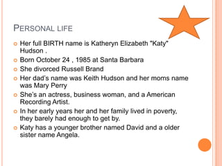 Katy Perry was born as Katheryn Elizabeth Hudson in 1985 in Santa Barbara, California. She was raised in a religious family by Pentecostal pastors and pursued her passion for music from a young age. Some of her most popular albums include One of the Boys, Teenage Dream, and Prism. She has had a long career as a singer, songwriter, and actress.