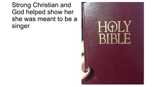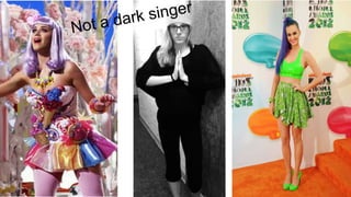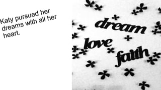 Katy Perry had a Christian upbringing singing gospel music but her early singles in that style did not gain attention. She then changed her musical style and released the hit single "I Kissed a Girl" which launched her popularity. Unlike some artists who lose themselves, Katy remains true to herself and her Christian values while gaining fans through her confidence and individuality. She supports communities and causes such as gay marriage while promoting a message of empowerment through her music.
