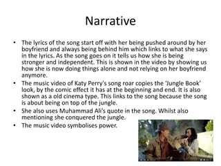 Katy Perry's music video for "Roar" symbolizes her journey to becoming stronger and independent. Throughout the video, the camera angles start high and look down on her when she feels weak, but end looking up as she gains confidence. Close ups show her connection to the audience as she conveys her message of empowerment. The editing uses faster cuts as the song builds intensity, representing her own transformation.