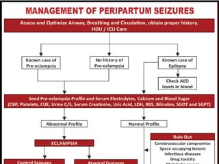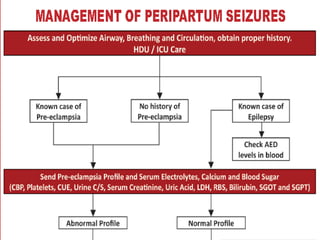 This document discusses peripartum seizures and provides several case studies. It outlines an algorithmic approach for evaluating and managing peripartum seizures. Causes can include preeclampsia, eclampsia, epilepsy, or other neurological conditions. Initial treatment involves magnesium sulfate, controlling blood pressure and monitoring. Atypical presentations require further investigation like imaging to rule out conditions like cerebral venous sinus thrombosis. MRI is generally preferred over CT for imaging during pregnancy due to risks of radiation and better detection of conditions like posterior reversible encephalopathy syndrome. Management after delivery includes continued magnesium sulfate, antihypertensives, anticonvulsants and thromboprophylaxis as needed.