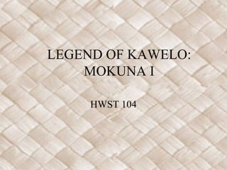 Kaweloleimakua is a legendary Hawaiian hero from Kauai. The story describes Kawelo's upbringing and training in martial arts. It introduces many characters including Kawelo's family and rivals from other islands. Place names mentioned provide geographic context and reference important locations on Kauai and Oahu that play roles in Kawelo's adventures. Chants and traditions and weapons are also outlined to immerse the reader in Hawaiian culture.