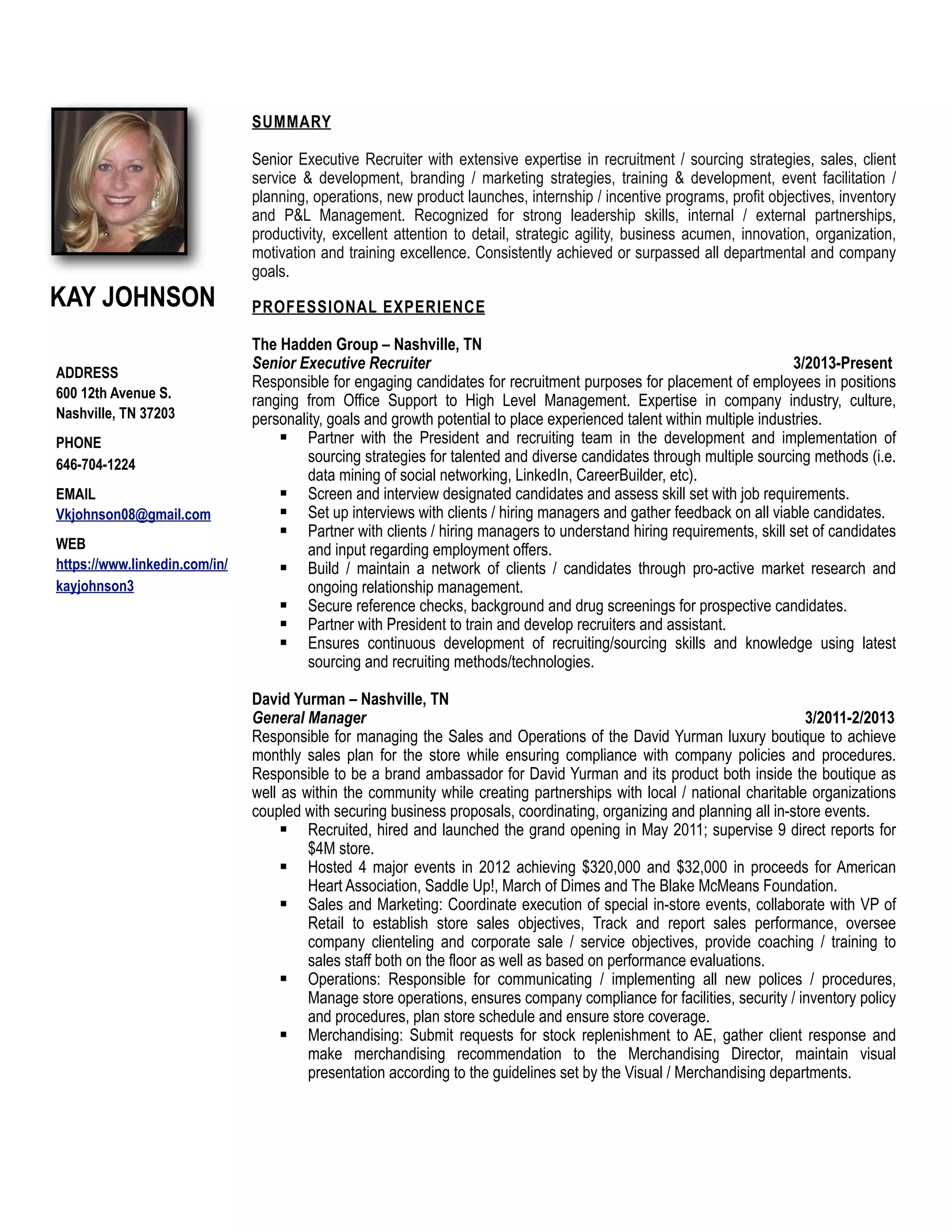 Kay Johnson is a senior executive recruiter with over 20 years of experience in recruitment, sales, operations management, and training. She currently recruits candidates for various positions at The Hadden Group in Nashville, TN. Prior to that, she held general manager roles at David Yurman and Restoration, and was the national senior director of Tommy Hilfiger's sales coordinator program, where she oversaw 85 employees and $165M in sales. Johnson has a bachelor's degree in communications from the University of Tennessee and has received several awards for her performance and leadership.