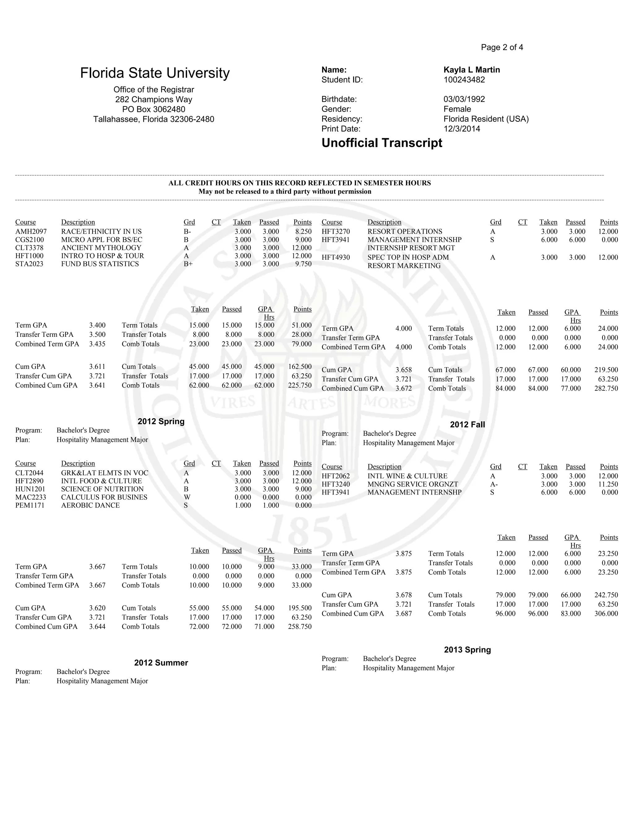 This document is Kayla L Martin's unofficial transcript from Florida State University. It shows that she transferred credits from three community colleges and began her undergraduate studies at FSU in 2010. She majored in Hospitality Management and took a variety of related courses, achieving good grades. By 2013 she had completed 100 credit hours and graduated with a GPA of 3.661.