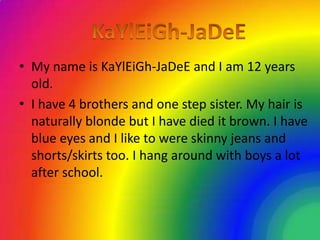 KaYlEiGh-JaDeE is a 12-year-old girl with 4 brothers and 1 step sister. She has naturally blonde hair that she dyes brown, blue eyes, and enjoys wearing skinny jeans, shorts, and skirts. Her favorite animal is a monkey because they are funny. At home she likes to eat toad in the hole, tomato soup, and stew and dumplings. At school she enjoys the pizza. Her hobbies include horse riding and playing football for her local under-13s girls team. She attends The Harwich School where her main teacher is Miss Ollite from Mauritius, who teaches French and learning skills.